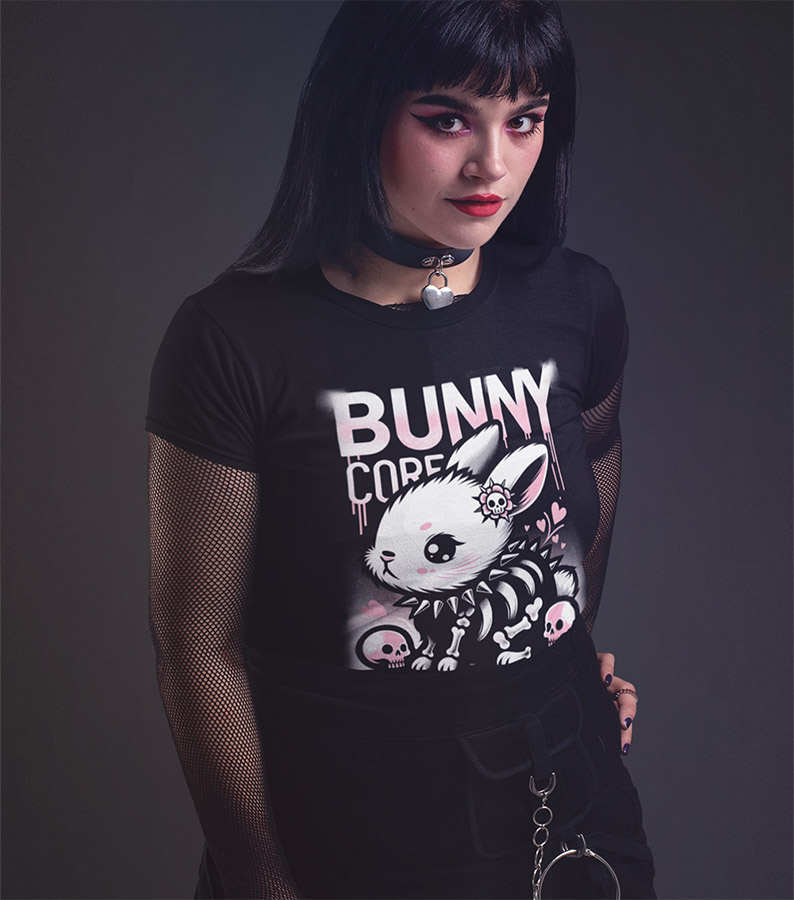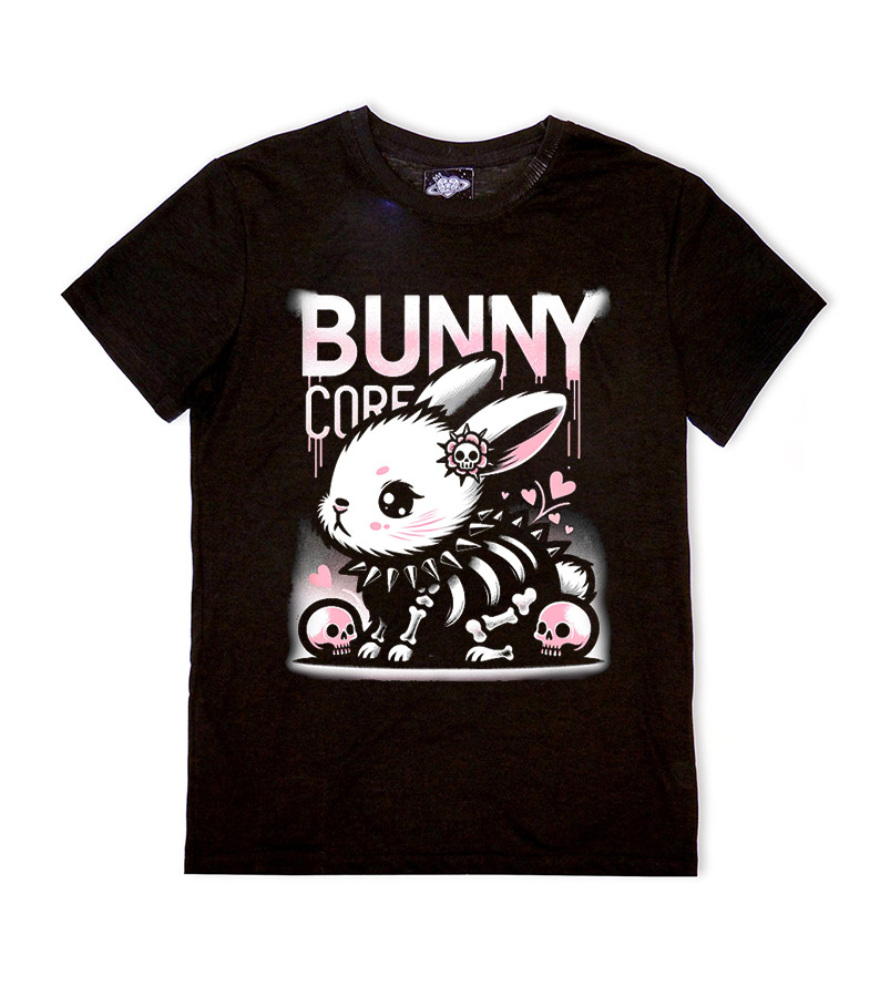 A unique unisex black T shirt from our Samples collection with our iconic all over ‘Bunny Core’ Print.