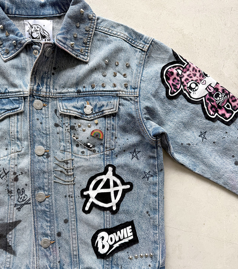 Hand printed item all made with organic colors. This cool Jeans Jacket Sample is full of amazing details, patches, studs, chains and pins!