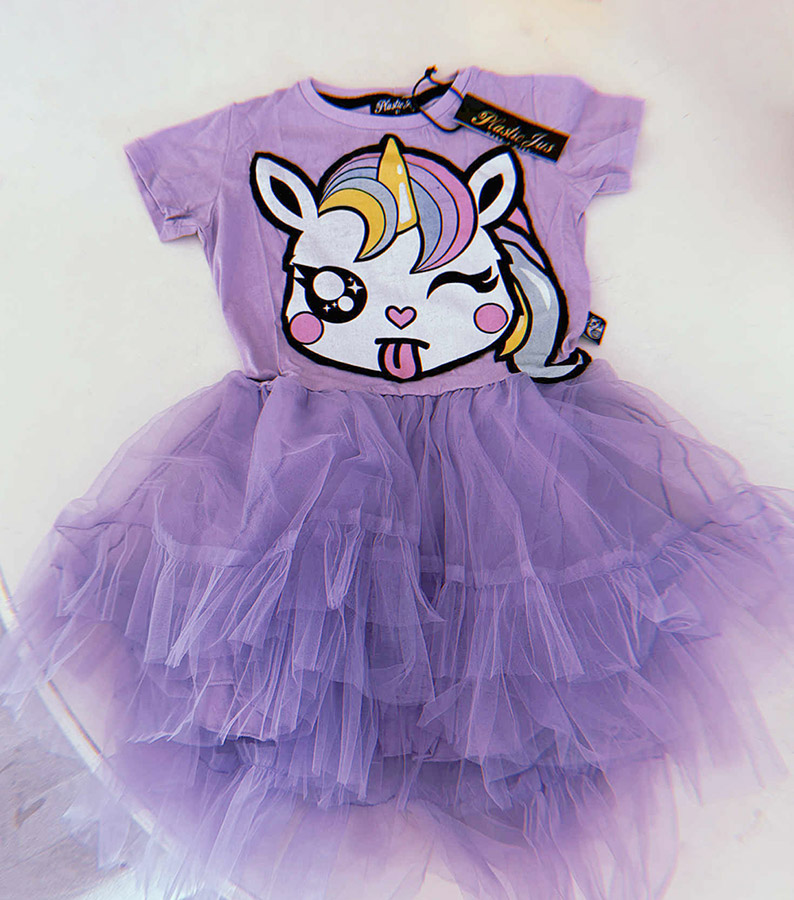A unique Rock and Roll girl purple dress, decorated with Tutu all around with our iconic ‘Unicorn’ Print.