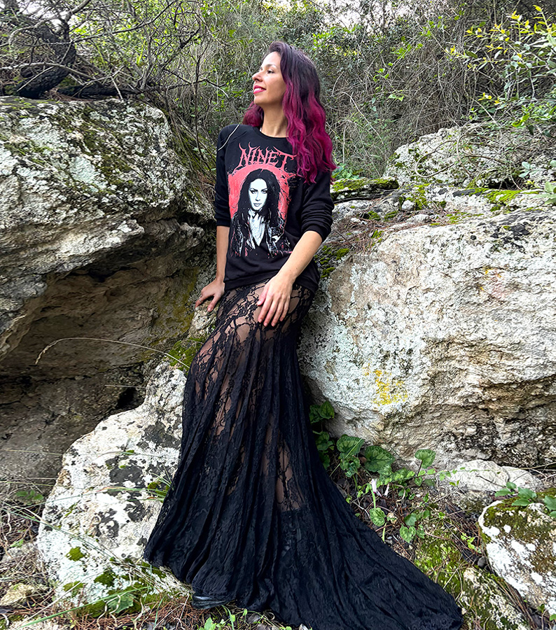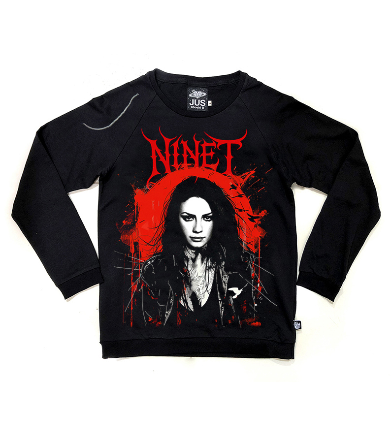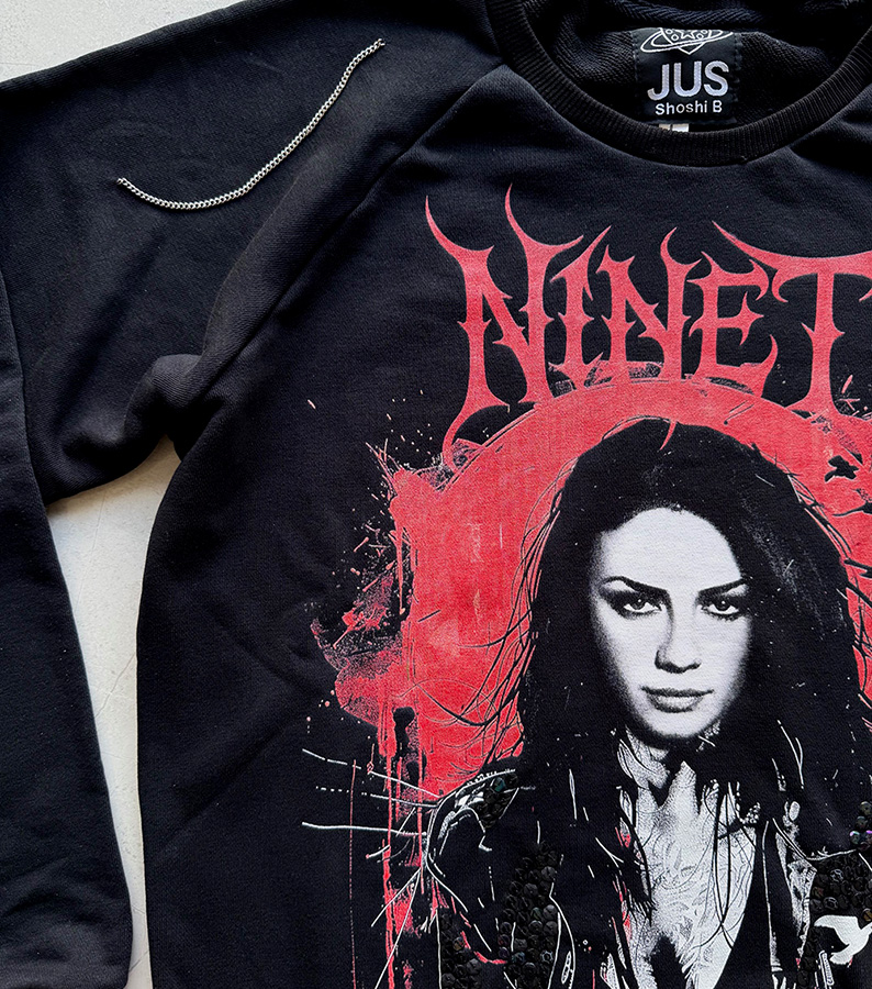 A unique black women sweater from our new ‘Ninet Tribute’ with the iconic all over ‘Sea Of Tears’ Print – With Sequins and Silver chain – Rare Sample!