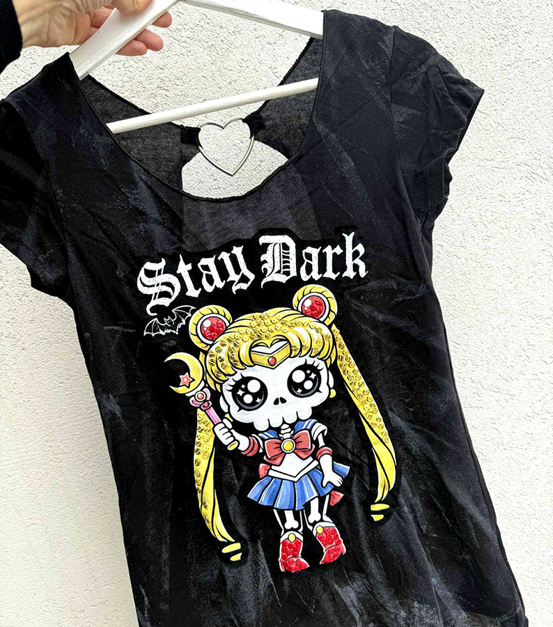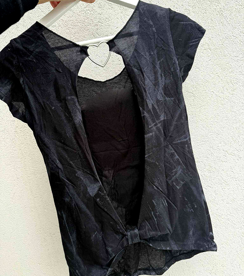 A unique Women open back T shirt with our iconic all over ‘Warrior’ Print, and a wash color texture on the fabric – With Sequins!